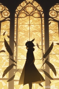 masterpiece, best quality, very aesthetic, 1girl, silhouette, backlighting, monochrome, {yellow and black monochrome}, sharp_shadows, geometric_pattern, standing, (stained_glass_window:1.4), hair_covering_one_eye, profile_view, long_coat, (feather_accessory:1.2), grainy_texture, high_resolution, huge_filesize, minimal_background, expressionless