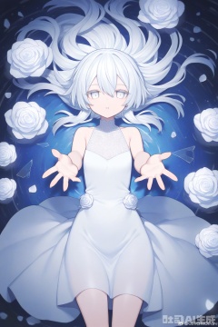 1girl,solo,long hair,dress,looking at viewer,white eyes,glass,white dress,grey eyes,white hair,flower,broken glass,white theme,dress flower,blue theme,bare shoulders,glass shards,white flower,reaching,reaching towards viewer,water,parted lips,closed mouth,sleeveless,reflection,sleeveless dress,white rose,watermark,expressionless,