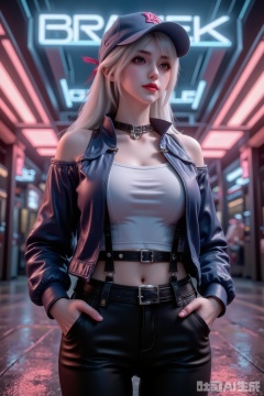 Masterpiece, the best quality, high quality,  huge breasts,,(white hair:1.4),(long legs:1.3),(thin legs:1.4),masterpiece, best quality, vibrant, very aesthetic, high contrast, semrealistic, newest, scenery, neon rim light, dark, 1girl, medium breasts, wide hips, huge butt, thick thighs, black (lowleg:1.3) leggings, crop top white shirt, (neon suspenders:1.2), dark blue open jacket, off-shoulder, platinum blonde,bob cut, sidelocks over shoulder,cowboy shot,from below, dutch angle, shiny dark eyes,looking away, hands in jacket pockets, oversized baseball cap, chewing gum, face focus, fine fabric emphasis, dynamic walking pose, twisty pose, head tilt, navel, wide shot, shiny skin, cyberpunk, BREAK, eyes, detailed eyes, masterpiece, best quality, amazing quality, very aesthetic, high resolution, ultra-detailed, absurdres, newest, scenery, depth of field, volumetric lighting