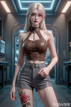 A young girl with light makeup, with long hair, a top wearing a brown halter neck turtleneck and gray low-waist leather pants. The leather pants are shorter, revealing her waistline and highlighting the vestline. There was a rose pattern on her thigh, revealing her smooth and fair skin. Wearing a pair of thin round-frame glasses, she looks very fashionable.