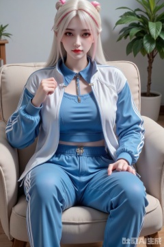 Masterpiece, the best quality, high quality, small breasts,,(white hair:1.4),(long legs:1.3),The image is a high-quality photograph featuring a young woman, likely in her early twenties, with a fair complexion and long, straight white hair styled in two pigtails. She is seated on a modern, beige fabric chair with a slightly textured surface. The background shows a cozy indoor setting with a wooden floor and a potted plant with green leaves in the corner, adding a touch of nature to the room.The woman is wearing a matching athletic outfit in blue and white, consisting of a zip-up jacket and tracksuit pants. The jacket has a white front panel and blue sleeves with white stripes along the edges, and it is unzipped to reveal a blue collared shirt underneath. Her tracksuit pants are also blue with white stripes down the sides. She is holding the jacket open with her right hand, showing the front panel and the blue shirt underneath. Her left hand is resting on her thigh.The photograph captures her from the waist up, focusing on her outfit and upper body. Her facial features are partially visible, but her expression is neutral, and her eyes are looking slightly downward. The overall atmosphere of the image is casual and relaxed, suggesting a comfortable and homey environment. The lighting is soft and natural, highlighting the colors of her outfit and the textures of the chair and floor.