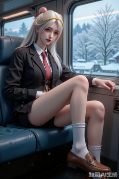 1girl,solo,black hair,yellow streaked hair,long hair,antenna hair,crossed bangs,blunt bangs,brown eyes,(tan:1.1),black school blazer,white shirt,red tie,blue serafuku,white sock,brown loafers, \\//, 1girl, solo, \ resting on train seat, forehead against window, \ trans-siberian railway carriage, frosted birch forests, abandoned stations, soviet-era luggage rack, \ blue hour exterior, warm tungsten interior, breath fog on glass, \ nostalgic color science, analog film texture, liminal space poetry
