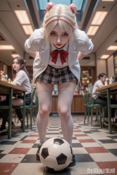 Masterpiece, the best quality, high quality, small breasts,,(white hair:1.4),(long legs:1.3), 1girl, argyle, argyle_background, argyle_legwear, bangs, bent_over, blunt_bangs, blur_censor, blurry, blurry_background, blurry_foreground, blush, board_game, bowtie, breasts, brown_eyes, cellphone_picture, checkered, checkered_background, checkered_flag, checkered_floor, checkered_kimono, checkered_legwear, checkered_shirt, checkered_skirt, chess_piece, classroom, depth_of_field, figure, focused, hair_bun, indoors, large_breasts, looking_at_viewer, motion_blur, perspective, photo_\(medium\), plaid, plaid_legwear, pov, race_queen, restaurant, school_uniform, skirt, soccer_ball, solo_focus, table, telstar, thighhighs, thighs, tile_floor, tile_wall, tiles
