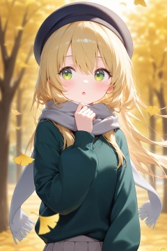 1girl, ginkgo leaf, solo, green eyes, long hair, scarf, leaf, hat, outdoors, black headwear, sweater, signature, skirt, tree, blonde hair, beret, long sleeves, hair between eyes, black sweater, blush, autumn leaves, autumn, falling leaves, parted lips, grey skirt, :o, blurry, day, hand up, blurry background, grey scarf, puffy long sleeves, upper body, open mouth, pleated skirt, looking to the side, green sweater, puffy sleeves