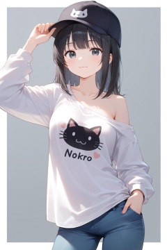 1girl, solo, black hair, hat, denim, pants, grey background, baseball cap, white border, jeans, shirt, looking at viewer, smile, border, black eyes, hand in pocket, white shirt, long sleeves, single bare shoulder, :3, hand on headwear, closed mouth, simple background, outside border, clothes writing, medium hair, adjusting headwear, off shoulder, cat print, animal print, breasts, black headwear, blue pants, adjusting clothes, collarbone, print shirt, medium breasts, standing, long hair, contrapposto, single off shoulder