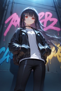 1girl,solo,long hair,looking at viewer,sharp eyes,bangs,jacket,shirt,black hair,hair ornament,long sleeves,urban street background,flowing hair,jewelry,closed mouth,standing,open clothes,choker,hairclip,black pants,necklace,bag,open jacket,white shirt,backpack,bandaid,zipper,leather jacket,graffiti wall,confident pose,hands in pockets,low angle shot,close-up,dramatic lighting,rim light,reflective light,soft shadows,detailed shading,cinematic atmosphere,wind blowing hair,urban night,neon reflections,dynamic composition,
