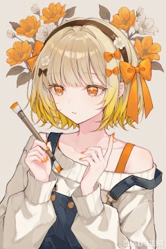 1girl, solo, short hair, bangs, blonde hair, simple background, hair ornament, long sleeves, bow, holding, jacket, upper body, flower, hair bow, hairband, off shoulder, nail polish, sweater, overalls, orange nails, holding paintbrush