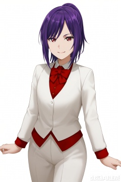 looking at viewer,Seta Kaoru,smile, bangs, red eyes,ponytail, purple hair, sidelocks