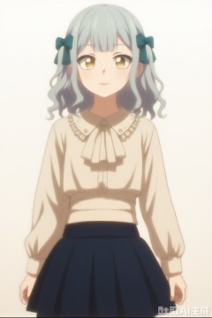looking at viewer,togawa sakiko,medium hair,bangs,ribbon,hair ribbon,black ribbon,two side up,blue hair,grey hair,sidelocks,blunt bangs,yellow eyes,wavy hair