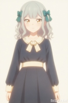 looking at viewer,togawa sakiko,medium hair,bangs,ribbon,hair ribbon,black ribbon,two side up,blue hair,grey hair,sidelocks,blunt bangs,yellow eyes,wavy hair