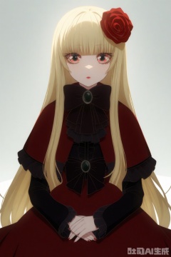 looking at viewer,doll_of_saki,long hair,bangs,hair ornament,long sleeves,dress,bow,flower,hair flower,capelet,blonde hair,red eyes,blunt bangs,bowtie,black bow,rose,red flower,red rose,black bowtie