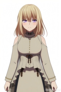 looking at viewer,Misumi Uika,blonde hair bangs,purple eyes,smile,medium hair,hair between eyes
