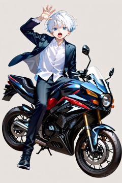 1boy,solo,grey background,simple background,full body,looking at viewer,arm up,hand up,sitting,open mouth,tongue,tongue out,blue eyes,white hair,short hair,black pants,pants,shirt,jacket,black jacket,white shirt,shoes,collared shirt,dress shirt,long sleeves,motorcycle,