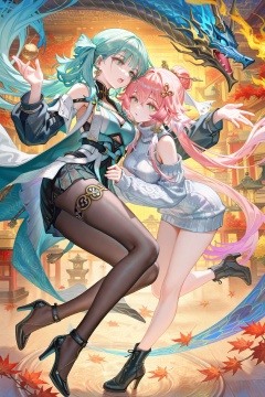 jinhsi\(wuthering waves\),8k,best quality,masterpiece,(ultra-detailed),(high detailed skin),((artist:reoen),(artist:fuzichoco),(artist:atdan),(artist:torino_aqua),year 2024:0.8),[artist:wlop],[artist:ningen_mame],artist:ciloranko,[[artist:rhasta]],artist:tidsean,colorful, jinhsi\(wuthering waves\),Changli\(wuthering waves\),high heels,multiple girls,2girls,long hair,sweater,earrings,jewelry,turtleneck,turtleneck sweater,pink hair,black footwear,grey sweater,breasts,