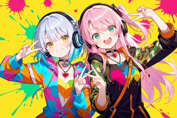 The image depicts three animated characters in a vibrant,colorful setting. They are wearing matching camouflage-themed bikinis and are positioned closely together,each making peace signs with their hands. The character on the left has long pink hair and is wearing a choker with a heart-shaped pendant. The character in the middle has short dark blue hair and is wearing a choker with a small heart-shaped pendant. The character on the right has short silver hair and is wearing a choker with a heart-shaped pendant and a pair of headphones. The background features a variety of bright colors,including green and orange,and appears to be a lively,artistic environment,possibly a studio or a creative space. There are also some paint-splattered surfaces and a spray can visible on the right side of the image.,