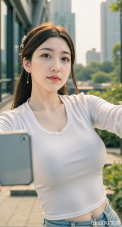 (masterpiece, best quality:1.2),Casual smartphone snap, busty beauty in crew-neck white tee and high-waist jeans, natural smile selfie, glass building and trees blurred in background, warm sunlight.(huge breasts:2.99),(full breasts:2.99),Xdongjixiaofu,Xlanbaixiaofu,XkjwjlzyY,XLiquidGlass,XiPhone17Pro,Xshuilian,XzhuxianbiyaoX,XnaiqiXY,Xzihanfu,Xzhiguangxishiyouxihuafei,Xqiyaoruqunhanfu