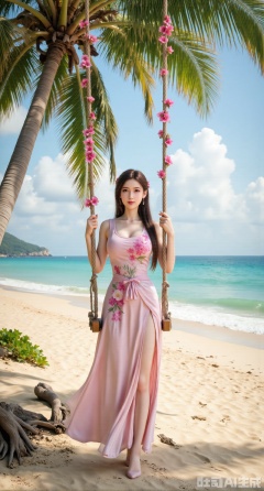 (masterpiece:1.2),(masterpiece:1.2),best quality,absurdres,masterpiece,original,extremely detailed wallpaper,perfect lighting,Golden sandy beach covered with vibrant flowers, turquoise waves gently lapping the shore, elegant woman in embroidered qipao swinging on a wooden swing under coconut trees, bright flower clusters spreading from sand to palm tree roots, soft natural light filtering through coconut leaves, ocean breeze lifting hair and qipao hem, high-resolution details showcasing petal textures and silk fabric sheen, ultra-wide angle lens capturing coastline panorama, cinematic color grading with soft focus on the central figure,(huge breasts:2.99),(full breasts:2.99),Xgechuanguangchongstyle,Xyuanxionggirl,Xyunxiao,XyunxiaoYK,Xdixionglianyiqun,Xmiaozufushi,Xqilinxianzi,XTifaLockhart,Xjinshenjianshenfu