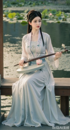 (masterpiece:1.2),best quality,(UE5.5,rendered with Unreal Engine 5,Unreal Engine 5,CG rendering:1.1), An elegant beauty dons a lotus-pink quju dress embroidered with twin lotus flowers, draped in a light blue sheer shawl. Sitting on a wooden platform by the water, she plays the guqin. Her reflection shimmers on the water below, and behind her lies a lotus pond in full bloom. Morning light gilds her hair. Fine embroidery stitches, refractive effect of translucent fabric, ripples and reflections on the water, soft morning light diffusion, draping effect of silk fabric, Chinese-style illustration style.,(huge breasts:2.99), (full breasts:2.99),,Xdongjixiaofu,Xlanbaixiaofu,XkjwjlzyY,XLiquidGlass,XiPhone17Pro,Xshuilian,XzhuxianbiyaoX,XnaiqiXY,Xzihanfu,Xzhiguangxishiyouxihuafei,Xqiyaoruqunhanfu