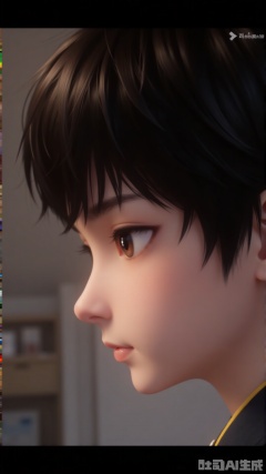 mengchuan, solo, short hair, brown hair, black hair, 1boy, brown eyes, closed mouth, male focus, artist name, indoors, blurry, from side, lips, profile, letterboxed, portrait, close-up, realistic, nose