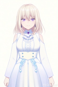 looking at viewer,Misumi Uika,blonde hair bangs,purple eyes,smile,medium hair,hair between eyes