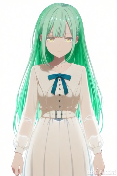 looking at viewer,Wakaba Mutsumi,long hair,green hair,bangs,blunt bangs,yellow eyes,hair ornament,hairclip