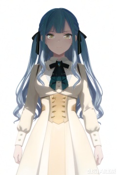 looking at viewer,togawa sakiko,long hair,bangs,ribbon,hair ribbon,black ribbon,two side up,blue hair,grey hair,sidelocks,blunt bangs,yellow eyes