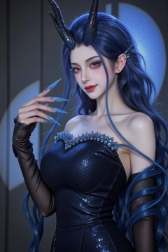 ZOZ_QR,a digital illustration shoot from a portrait camera angle about a fantasy character with blue hair and horns,dressed in a dark,shimmering outfit adorned with sequins,the image also shows a dark fantasy theme,on the middle of the image,a young woman with pale skin and long,wavy blue hair,who appears to be in her early twenties,is standing with her upper body facing the viewer,looking directly at them with a seductive expression,she has red eyes and is wearing a black,strapless dress with a fitted bodice that accentuates her large breasts,her hair is styled in a long,flowing manner,and she has a pair of black horns on her head,she is also wearing black,fingerless gloves that add to her mysterious and alluring appearance,her fingernails are painted with blue nail polish,which adds to the overall dark and moody atmosphere of the scene,the background is a dimly lit room with a large,glowing blue orb behind her,creating a dramatic effect,