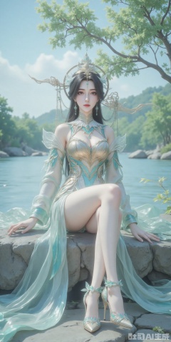 Ultra clear, wallpaper, 8k, sitting,masterpiece, masterpiece,best quality,high quality,,chromatic_aberration,Hair accessories,tree,blue sky ,river,Super long legs,stone,green shirt , ,High heeled sandals,earring,black hair,Light Blue Theme,long legs ,thin legs (masterpiece,wallpaper,best quality:2),1girl,full body,hanfu,full_shot,wallpaper,full body,beautiful legs,seductive_smile,socks_removed, looking_at_viewer,dumpling_Hug_Pillow,cleavage,huge Breasts,embossed high heels,plns_high heels,huaxiangr,magnificent,embossed high heels