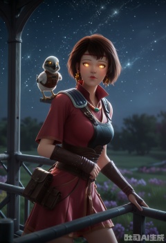 1girl, solo,short dress, short hair, brown hair, yellow eyes, glowing eyes, dark,jewelry, earrings, indoors, necklace, armor,lips, headband, bird, shoulder armor, pauldrons, realistic, shoulder pads, animal on shoulder, bird on shoulder,