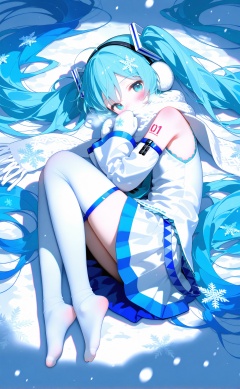 masterpiece,very aware,highres,absurdres,newest,best quality,loli,petite,high quality,chromatic_aberration,//,1girl,hatsune miku,yuki miku,solo,long hair,snowflakes,thighhighs,twintails,earmuffs,blue eyes,very long hair,scarf,detached sleeves,skirt,blue hair,fetal position,mittens,thigh boots,hair ornament,looking at viewer,white thighhighs,snow,white scarf,plantar flexion,on side,boots,full body,snowing,lying,zettai ryouiki,white mittens,necktie,sleeveless,floating hair,bare shoulders,aqua hair,sleeveless shirt,white skirt,covering own mouth,aqua eyes,shirt,snowflake hair ornament,no shoes,blush,