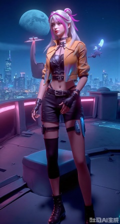 (masterpiece, best quality:1.2),twin tails in gradient purple-blue, ear bone chains connected to mini projectors, wearing a cropped neon orange tactical jacket over a silver crop top, a leather belt with tactical pockets at the waist, slim jeans with glowing roller skates, showing a peachy hip and straight legs. The background is a future city rooftop with a giant holographic moon, floating ecological dome cities in the distance, neon strips flowing on metal railings, and drone swarms crossing the indigo sky. Movie-level quality, HDR high dynamic range, intense color saturation, natural fabric wrinkles and light refraction, clear skin pore details..(huge breasts:2.99),(full breasts:2.99),Xdongjixiaofu,Xlanbaixiaofu,XkjwjlzyY,XLiquidGlass,XiPhone17Pro,Xshuilian,XzhuxianbiyaoX,XnaiqiXY,Xzihanfu,Xzhiguangxishiyouxihuafei,Xqiyaoruqunhanfu,Xwangxixianzi,Xsanshang,Xyujiafu,Xnanxiaochen,Xloubeimaoyi