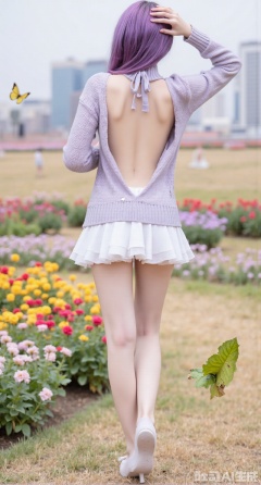 (masterpiece, best quality:1.2),In a dreamy Japanese style, a girl with long purple hair is wearing a light purple backless sweater decorated with star sequins, paired with a white tulle skirt, showing her dreamy figure, with a mysterious back line. The scene is a flower sea in spring, where colorful flowers are in full bloom and butterflies are flying, as if in a fairyland. The picture is in high resolution, with dreamy and gorgeous colors, rich details, delicate skin texture, and soft lighting.