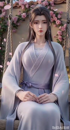 (masterpiece:1.2),best quality,(UE5.5,rendered with Unreal Engine 5,Unreal Engine 5,CG rendering:1.1),A flower courtesan wearing a jadeite hair crown dons a moon-white bellyband embroidered with grape vine patterns, paired with a light purple wide-sleeved ruqun. Sitting on a swing surrounded by blooming flowers, she plays the zheng. As she plucks the strings, falling pear blossoms dance with the musical notes. Behind her, a courtyard wall is covered with climbing roses, and sunlight rims her figure with gold. Transparent texture of jadeite, draping effect of silk, detailed strings of the zheng, falling petal trajectories, bright and soft color tones, 8K resolution, fine dynamic rendering, romantic spring atmosphere.,(huge breasts:2.99),(full breasts:2.99),Xgechuanguangchongstyle,Xyuanxionggirl,Xyunxiao,XyunxiaoYK,Xdixionglianyiqun,Xmiaozufushi,Xqilinxianzi,XTifaLockhart,Xjinshenjianshenfu,Xluxueqishuiyi,Xhongqipao