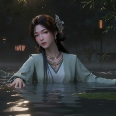 mn,girl,mn,This is a highly detailed CGI rendering of a young Asian woman with fair skin and long,dark brown hair adorned with a silver hairpin. She wears an elegant,pale green kimono with intricate patterns,and a gold necklace with a pendant.,Her arms rest gently on the water's surface,and her head is turned slightly to the side,gazing into the distance. The scene is enhanced by dramatic lighting that creates a soft glow on the water's surface and highlights the steam rising from the hot spring. The background features lush bamboo and distant lanterns,adding depth and a sense of tranquility to the atmosphere., WALLPER, masterpiece:1.2),best quality,high resolution,unity 8k wallpaper,(illustration:1),perfect lighting,extremely detailed CG,finely detail,extremely detailed,soft lighting and shadow,soft yet striking lighting,film grain:1.2,(skin pores:1.2),(detailed skin texture:1),((solo:1.5)),Detailed face,(see-through:1.1),misty,Low Key:1.1,depth of field,(masterpiece, best quality, highres:1.2),minimalism,realistic,(unified picture:1.1),(A girl standing in water, upper body above, lower body submerged:1.8),upper body on the water,lower body below the surface,(1girl:1.1),(solo:1.1),(on the water were giant lotus flowers and leaves:1.4),(giant lotus leaves grow out of the water:1.2),(Cirrocumulus:1.1),(below the surface are schools of giant koi:1.3),(giant koi:1.1),black hair,long hair,white dress,wet clothes,wet body,wet hair,clear and clean water,[ripples],(from_below:1.4),look at viewer,depth of field,(simple_background:1.2),