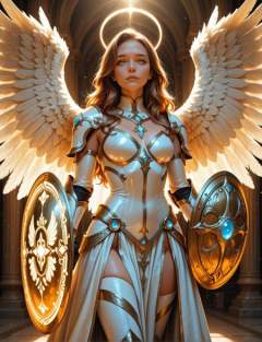 IllusP0s, realistic shadows , volumetric lighting, ray tracing , detailed skin, masterpiece,,best quality,amazing quality, realistic background, , (lineart:1.7), ,,8k, very detailed, highly detailed texture, extremely detailed skin, ultra-realistic,masterpiece, very aesthetic, absurdres, (realistic:1.2), ,, ((artwork)), ((perfect anatomy)), extremely detailed skin, detailed faces, , gorgeous face, extremely detailed skin,((artwork)), ((perfect anatomy)), extremely detailed skin, detailed faces, ,, gorgeous face, extremely detailed skin, ,sharp focus,hdr,Female angel, radiant white armor adorned with gold and floral motifs, glowing shield with runes of protection, golden bow strung with light, large feathered wings glowing with a warm golden hue, long wavy auburn hair.