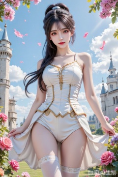 (day),flowers meadows,castle,1girl, solo, pink hair, ponytail,dress,  armor, sword, white dress, armored dress,dress, breasts, looking at viewer, long hair,  collarbone, hair ribbon, yellow eyes, braid, detached sleeves,Roses, petals. flower,(thighhighs with rose pattern:0.8),armor_thighhighs,