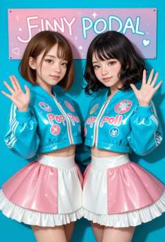 2girls, so cute japanese idols, /(from: J-pop idol groupe or K-pop idol groupe,/) mini,long bob hair, wavy hairdance, idol puffy costume, gravure pose, limbs out frame,cowboy shot, from abovesilver, bluefunnyart style, flat matt two tone colored background, emotional face, emotional sign,CD jacket, sbsurdres, masterpiece, NiJi, drop shadow