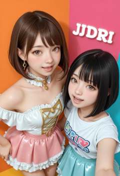 2girls, so cute japanese idols, /(from: J-pop idol groupe or K-pop idol groupe,/) mini,long bob hair, cury hairdance, idol puffy costume, gravure pose, limbs out frame,dynamic angle, from abovegold, orangesmile, open mouth,art style, flat matt two tone colored background, emotional face, emotional sign,CD jacket, sbsurdres, masterpiece, Niji, drop shadow, tyndall effects