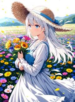 lens flare, masterpiece, best quality BREAK1girl,solo,white hair,long hair,blue eyes,white frilled dress,pinafore dress,straw hat,upper body,hugging flower,flower field,wind,particles,sunlight,blurry background,colorful,from side,scenery,