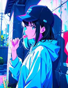 1girl,solo,black hair,licking lollipop,looking at viewer,upper body,(profile:0.4),hoodie,hat,colorful,outdoors,wall,anime coloring,(masterpiece,best quality,very aesthetic,highres,absurdres,newest:1.1),