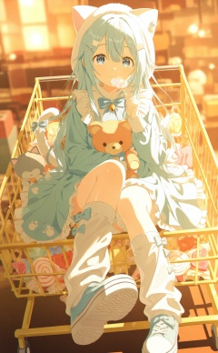 masterpiece,very aware,highres,absurdres,newest,best quality,loli,petite,high quality,chromatic_aberration,cinematic_angle,dutch angle,//,1girl,shopping cart,stuffed toy,candy,wing hair ornament,stuffed animal,lollipop,thighhighs,food,blue eyes,holding,holding stuffed toy,white thighhighs,holding lollipop,solo,blue hair,holding food,bell,animal ears,holding candy,looking at viewer,eyepatch,hair ornament,cat ears,neck bell,stuffed cat,dress,long sleeves,frills,blush,bow,swirl lollipop,bowtie,shoes,loose socks,long hair,cat tail,tail,hair between eyes,hairclip,:3,jingle bell,blue footwear,closed mouth,blue dress,smile,teddy bear,blue bow,heart,sneakers,blue theme,x hair ornament,fish hair ornament,fake animal ears,leg warmers,sleeves past wrists,blue bowtie,hood,box,pastel colors,sitting,cat hood,frilled dress,double-parted bangs,//,official art,depth of field,detailed light,blurry background,best shadow,shiny skin,cinematic lighting,ray tracing,amazing quality,very aesthetic,absurdres,beast quality,ultra detailed,newest,8K,HDR,//,<lora:BA2——【Illustrious】hans:0.4>,<lora:chahua——【noob】hans:0.8>,