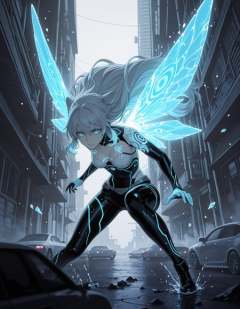 embedding:SmoothNoob_Quality, masterpiece, best quality, newest, absurdres, highres, very awa, very aesthetic, ultra-detailed,   EBSuphia, 1girl, futuristic cybernetic cityscape, neon rain reflection, glowing energy tattoos, porcelain skin with bioluminescent veins, ultra-detailed hair animated by breeze, jaw-dropping cosmic eyes, zero-gravity strands drifting, holographic data streams swirling around her, crystalline wings folded behind, floating shards of shattered mirrors reflecting traffic of flying cars, intense chromatic aberration, lens flares, raindrops freezing mid-air, cinematic ultra-wide shot, high-resolution photorealistic render                  <lora:SuphiaIL-10:1>