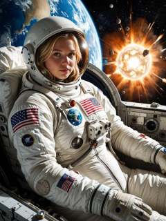 space, realistic, planet, earth (planet), 1girl, spacesuit, american flag, astronaut, spacecraft, blonde hair, helmet, explosion, sun, science fiction, solo, looking at viewer, flying, soft natural lighting, cinematic lighting, ultra-detailed skin texture, expressive eyes, shallow depth of field, bokeh effect, photorealistic, high contrast, natural colors