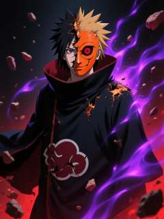 Hokage Ninjia,(Obito Uchiha:1.3), broken orange mask revealing sharingan and rinnegan, half-burned cloak, glowing purple chakra, torn Akatsuki cloak, intense shadows, floating debris, red and purple lighting, cinematic close-up, dark background, swirling energy, high detail