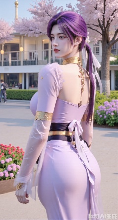 (masterpiece, best quality:1.2),In a dreamy Japanese style, a girl with long purple hair is wearing a light purple backless sweater decorated with star sequins, paired with a white tulle skirt, showing her dreamy figure, with a mysterious back line. The scene is a flower sea in spring, where colorful flowers are in full bloom and butterflies are flying, as if in a fairyland. The picture is in high resolution, with dreamy and gorgeous colors, rich details, delicate skin texture, and soft lighting.