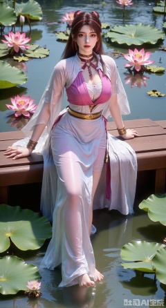 (masterpiece:1.2),best quality,The image is a digital illustration of a young woman sitting on a wooden bench in a pond with lily pads. She is wearing a long dress with design on the chest and sleeves. The dress has a high neckline and short sleeves,Holding a lotus in hand. She has long dark hair styled in loose waves and is wearing gold high heels. The woman is posing with one hand on her hip and the other resting on the edge of the bench. The background is filled with pink and white lotus flowers and green leaves. The overall mood of the image is peaceful and serene,(huge breasts:2.99),(full breasts:2.99),(Background with traditional Chinese architecture, lotus pond and pink lotus flowers:1.39),gechuanguangchongstyle,Xyuanxionggirl,Xyunxiao,XyunxiaoYK,Xdixionglianyiqun,Xmiaozufushi,Xqilinxianzi,XTifaLockhart,Xjinshenjianshenfu,Xbigbreasts,Xrixirenxiangsheying,XzhaoxiangerX,Xnanxiaochen2