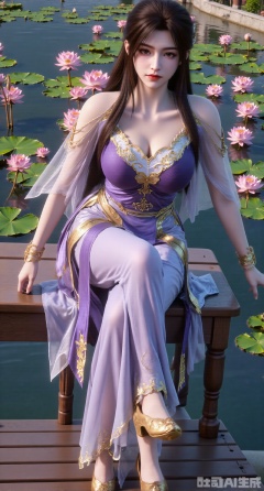 (masterpiece:1.2),best quality,The image is a digital illustration of a young woman sitting on a wooden bench in a pond with lily pads. She is wearing a long dress with design on the chest and sleeves. The dress has a high neckline and short sleeves,Holding a lotus in hand. She has long dark hair styled in loose waves and is wearing gold high heels. The woman is posing with one hand on her hip and the other resting on the edge of the bench. The background is filled with pink and white lotus flowers and green leaves. The overall mood of the image is peaceful and serene,(huge breasts:2.99),(full breasts:2.99),(Background with traditional Chinese architecture, lotus pond and pink lotus flowers:1.39),gechuanguangchongstyle,Xyuanxionggirl,Xyunxiao,XyunxiaoYK,Xdixionglianyiqun,Xmiaozufushi,Xqilinxianzi,XTifaLockhart,Xjinshenjianshenfu,Xbigbreasts,Xrixirenxiangsheying,XzhaoxiangerX,Xnanxiaochen2