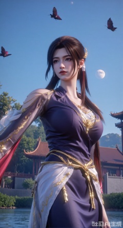 (masterpiece:1.2),best quality,(UE5.5,rendered with Unreal Engine 5,Unreal Engine 5,CG rendering:1.1), highres, extremely detailed, 1girl,(long hair:1.26),School Uniform,looking at viewer, whole body,(big breasts:2.69),Depth of field, (butterflies, ultra detailed, glary,Light, light particles,glitter,reflect:1.29),(huge breasts:2.99), (full breasts:2.99),background, solo, makeup,(Lotus,Water Lily,Blue sky,full moon:1.39),(Lotus pond,ancient Chinese architecture:1.39),gechuanguangchongstyle,Xyuanxionggirl,Xyunxiao,XyunxiaoYK,Xdixionglianyiqun,Xmiaozufushi,Xqilinxianzi,XTifaLockhart,Xjinshenjianshenfu,Xbigbreasts,Xrixirenxiangsheying,XzhaoxiangerX,Xnanxiaochen2