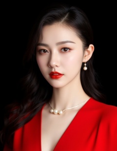 A photograph of a young Asian woman with fair skin and long, wavy black hair, styled in a loose ponytail. She has delicate, symmetrical facial features, subtle makeup with red lipstick, and is wearing a bright red V-neck top. She is accessorized with small pearl earrings and a delicate necklace featuring three pearls. The background is a solid black, making her the focal point.
