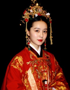 The image depicts a beautifully dressed figure adorned in traditional attire,likely from an East Asian culture. The individual is wearing a richly embroidered red robe with intricate golden patterns,suggesting a high status or ceremonial role. The person's headdress is elaborate,featuring gold and jewels,with long,dangling strands of beads or silk adding to the opulence. The earrings are large and ornate,with green and red elements,complementing the overall regal appearance. The background is dark,which contrasts with the bright,detailed clothing and headdress,drawing attention to the figure's elegant and majestic presence.,